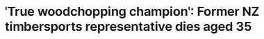 (Just how many ‘dropping like flies’ … is it gonna’ take? Two top wood chopping champions have already died! Hundreds of similar Kiwi deaths, not reported on!)